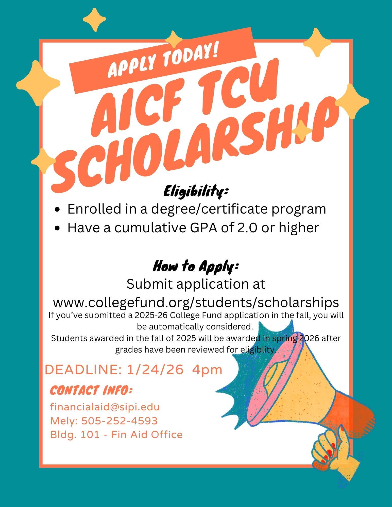 Currently enrolled students who find themselves in dire need of financial support in order to manage an unexpected situation that may cause them to quit school are encouraged to apply. A paper application can be found at the SIPI Board of Regents office (OT 142B) or SIPI Financial Aid Office (OT 143/174) or Dr. Cometsevah 505-922-4093.