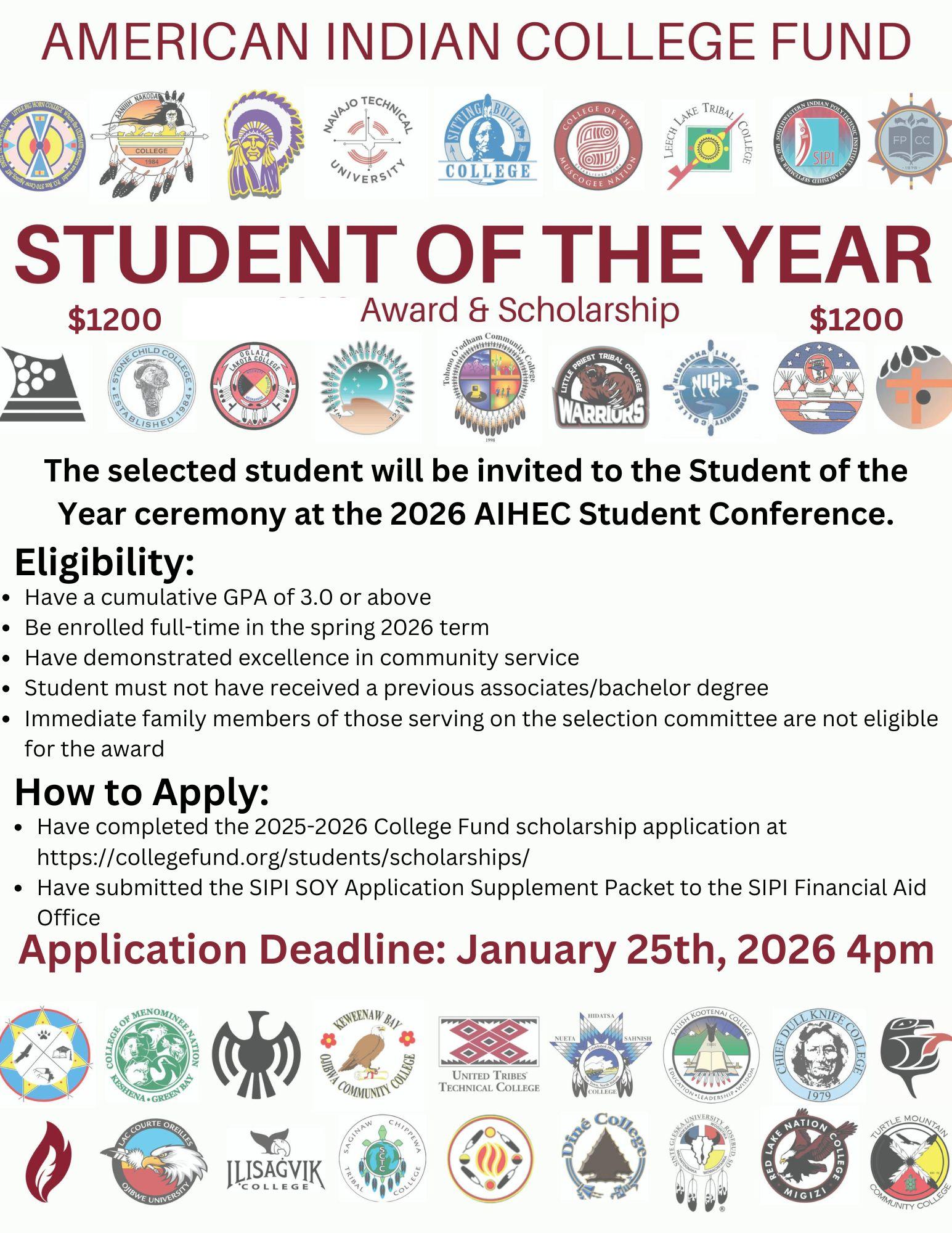 The selected student will be awarded a $1200 scholarship from the American Indian College Fund and be invited to attend an awards luncheon at this year's AIHEC Student Conference in Bismark, ND.